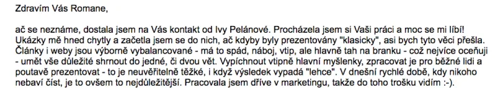 Tenhle nevinně začínající e-mail z podzimu 2016 stál na počátku spolupráce s paní, která mi později nevědomky pootevřela bránu k velmi bonitnímu klientovi.
